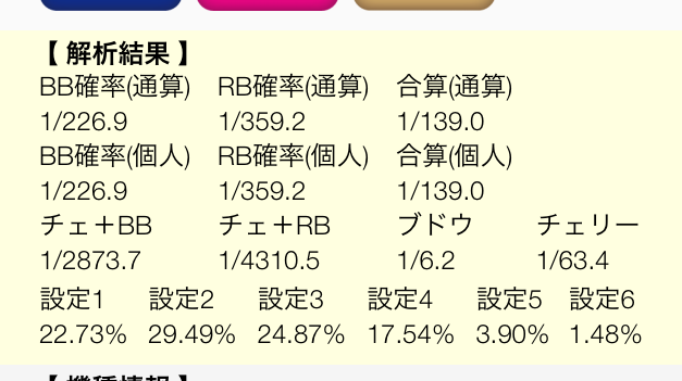 マルハングランドオープンに伴う近隣店の状況 その他 2017年08月21日 0 マルハンどう考えてもジャグラーに6は使ってない 5すら怪しい 今のところ最高設定4ですね と言うことで 近隣の店舗はマルハングランドオープンにより変化があったのか? いって来ました 毎月第3土曜日が熱めだというV店 マルハンのグランドオープン期間も終わり最初の第3土曜日です やる気を見せるならこの日でしょう この日はGOGOジャグラーに着席 前々日にBIG4REG12と大きくREGが先行している台 前日は200GでREG1回のみ 朝一一発目は12GでREG 次 55G REG 83G BIG 5G BIG 199G BIG 1G BIG 51G REGチェリー と順調な出だし いきなり結果ですが BIG38 REG24 総回転数8621G 獲得枚数1757枚 ツールに入れるとこんな感じ ぶどうが良かったので期待したがどうやら4程度のようです チェリーボーナスは入れ忘れがあるのでもっと良いです 下手すれば3とかかも知れません 途中がかなりしんどかった 他を見渡しても5・6らしきジャグラーはなし プラスになったから良かったもののこの店はマルハンと張り合う気がないのか? 続いてでちゃうガールズ来店で良く通うH店 マルハングランドオープン真っ只中でお盆の真っ只中 15日にマルハンの整理券2桁代を持っていたが大したこと無いので H店に行った この日はジャグラーガールズが全台系になっていて 大体別積みの鉄火場状態 その島内にある他の機種もまあまあ出ていた ニューパルサーも一時全機種か?と思うほど出ていた 残念ながら私はジャグラーガールズは打てなかったが ニューパルサーとクレアでプラス そして昨日、昼過ぎに来店しファンキージャグラーに着席 BIG5会 REG6回 で、合成確率1/200の一見クソ台のような台だったが 状態の悪いときはこの程度の数値になることはあると思い着席 300G程から打ち始め406GでBIG そこから連チャンをはじめ1000枚弱のメダルを獲得 途中揉まれたがぶどうが目に見えてよく玉持ちが良い そして連チャンをはじめたと思ったら凄まじい連チャン! 1撃で2000枚オーバーの大連チャンをかましてくれた 途中息子が負けていたので連チャン中台を譲ってメダルを流すと2870枚 その後すぐに息子も連チャンさせていたのでトータル4000枚は出ていたな この台のデータはツールには入れていたがデータがクリアされていたので 詳しいことは載せられません すみません 他にも良く出ている台が多数あり好印象でした マルハンよりこちらの方が良いな しっかり張り合ってくれているようです この調子で頑張って欲しいものです 今のままではマルハンのパチスロは客が飛ぶでしょう 逆にマルハン潰すつもりで岡山県のチェーン店の力を見せてもらいたいものです にほんブログ村 よろしければポチッとお願いします パチスロ ブログランキングへ こちらもポチッと! こんな記事も書いています スポンサード リンク 設定6を掴む為のスロット営業解体新書 管理人アボットも購入しました! アボットのレビューを見てみる 設定6を掴むためのジャグラー営業裏話 パチスロあんてな PR http://kinslo.7narabe.net/%E3%81%9D%E3%81%AE%E4%BB%96/%E3%83%9E%E3%83%AB%E3%83%8F%E3%83%B3%E3%82%B0%E3%83%A9%E3%83%B3%E3%83%89%E3%82%AA%E3%83%BC%E3%83%97%E3%83%B3%E3%81%AB%E4%BC%B4%E3%81%86%E8%BF%91%E9%9A%A3%E5%BA%97%E3%81%AE%E7%8A%B6%E6%B3%81マルハングランドオープンに伴う近隣店の状況