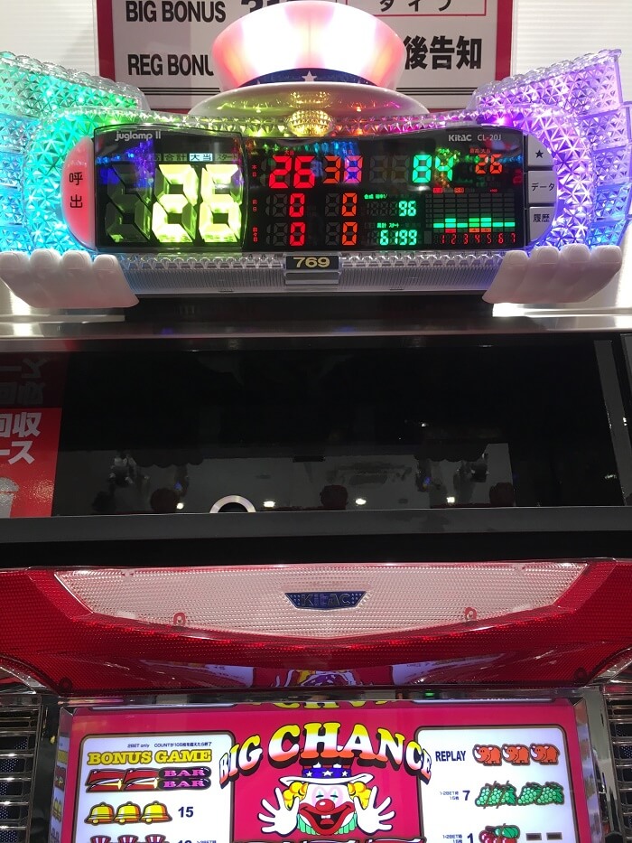 グランドリニューアル初日 ゴーゴージャグラー 機種実戦 2018年12月31日 0 12月28日、ジャンボ邑久店グランドリニューアルオープン初日 入場抽選券をゲットし損ねた為、開店してからの入店 ぶらぶらと店内を見渡すが、まずまず良さそう 悪くはないな 1台台が空いたので見に行くが、これはイマイチ ノーボーナスで400ハマリのニューアイムジャグラー・・・スルーです さらにぶらぶらしているともう1台空きが 見に行くと、BIG 0 REG 2 初当たり 130G程でREG 2回目 150G程でREG 現在 150Gほど これくらいならまだまだ分からない、むしろこんなのが良い場合がよくある 迷わず着席! 打ち始めて1回転でREG! 20G程でREG 60G程でREG REGばっかり さて結果は・・・ 終始REG先行 私はREG信者ではないが出方的には悪くない ジャグラーコーナーは座ったままでスランプグラフが見れないデータ表示器で 履歴も7回分しか確認できないし、データの公開もしていないようなので 詳細データは掲載できませんが、 悪くないどころかかなり良い! 最終的に BIG 26回 REG 38回 総回転数 6199G 獲得枚数 4001枚 総投資 10,000円 回収 85,000円 プラス 75,000円 最近はチェリーはカウントしていない 解析結果はぶっちぎりで6だが、 個人的には5と思ってます でも6かもしれない 上出来でした! ありがとう! にほんブログ村 よろしければポチッとお願いします パチスロ ブログランキングへ こちらもポチッと! こんな記事も書いています スポンサード リンク 設定6を掴む為のスロット営業解体新書 管理人アボットも購入しました! アボットのレビューを見てみる 設定6を掴むためのジャグラー営業裏話 パチスロあんてな PR http://kinslo.7narabe.net/%E6%A9%9F%E7%A8%AE%E5%AE%9F%E6%88%A6/%E3%82%B0%E3%83%A9%E3%83%B3%E3%83%89%E3%83%AA%E3%83%8B%E3%83%A5%E3%83%BC%E3%82%A2%E3%83%AB%E5%88%9D%E6%97%A5%20%E3%82%B4%E3%83%BC%E3%82%B4%E3%83%BC%E3%82%B8%E3%83%A3%E3%82%B0%E3%83%A9%E3%83%BCグランドリニューアル初日 ゴーゴージャグラー