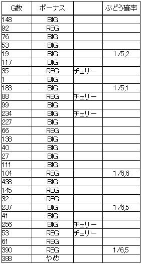 実戦 ハッピージャグラーⅦ 機種実戦 2017年03月25日 0 本日はジャグラーが特定日の某ホールへ この店もそれほどお客はいない なので昼過ぎにホールへ到着 ファンキージャグラーやゴーゴージャグラーを回してみるが手応え無し もう発掘されつくしたか? 残るはハッピージャグラーぐらいかな と言うことで、まだ当たってなくて30G程しか回ってない台へ 打ってみるとそこそこぶどうが揃う 100G以内で当たってほしいところだが当たらず 設定6でも100Gスタート200Gスタートはまああるし、 いきなりクソハマリからスタートする場合もまれにある しかし調子良いやつはやはり100G以内で当たりやすいと思っている ぶどうは良く揃うしもう少し打ってみる 3,000円目、これでやめと言うところでペカ! 143G BIG 以下データ 最初ぶどうの出現率が非常に良くて1/5,2だったが 途中からこれまでとは別物か?というくらいぶどうが揃わなくなり 最終的には1/6.5になりました 1/5,2は出来すぎだし、 少しは期待したが途中の動きで6ではないと思っていたが… 4はあるか?と思っていたが へたすれば4も無いかもしれない 状態の良かった3じゃないかな? メダルを流すと1341枚 この店は47枚貸しの等価だから28,500円 総投資12,000円 プラス16,500円 ジャグラーシリーズの中でも少し異色なハッピージャグラー リール配列も他のものとは全然違うし ハッピージャグラーで通常時中押し7狙いをしている人を良く見かけるが ピエロとベルをフォローするなら右押しの方が良いと思うのだが… チェリーを察知するだけで中押しをしているなら普通に左チェリー狙いで良いのに… 私は順押しで7の上にあるチェリーを狙っています すると普通は左リール中段にBARが停止する そしてぶどうが成立しているときはBARが上段・下段に停止する そしてこの停止型でぶどうが外れたら ペカッ! だいたいぶどう外れ型でペカります アツい停止型 ↑ ぶどうがテンパイしていないのでこの時点でおそらくピエロorボーナス ボーナス絵柄を狙うも良し、 空回ししてトイレに行くも良し ボーナス成立していて空回しした場合、ハッピーは自動停止しないので、 リールが回っていても勝手にGOGOランプが点灯します 左リール中段にBARが停止したらハズレかリプレイ 中段BARからボーナスはないのか?といえばそんな事は無い たまにぺかります BAR中段からぶどうが揃ったことは無いので BAR中段停止で中リールぶどうテンパイはおそらく2リール確定かも? 先光りした場合もハッピーは小役優先制御なので 7の上のチェリーを狙っているとチェリー同時成立ならチェリーが停止するし、 単独ならBARをひき込むし ぶどうならぶどうが停止するので変則打ちする必要がないです ピエロ・ベルを取りたいなら変速打ちしないといけないですが… ジャグラーシリーズの中でもハッピーはお気に入りの部類ですね! にほんブログ村 よろしければポチッとお願いします パチスロ ブログランキングへ こちらもポチッと! こんな記事も書いています スポンサード リンク 設定6を掴む為のスロット営業解体新書 管理人アボットも購入しました! アボットのレビューを見てみる 設定6を掴むためのジャグラー営業裏話 パチスロあんてな PR http://kinslo.7narabe.net/%E6%A9%9F%E7%A8%AE%E5%AE%9F%E6%88%A6/%E5%AE%9F%E6%88%A6%E3%80%80%E3%83%8F%E3%83%83%E3%83%94%E3%83%BC%E3%82%B8%E3%83%A3%E3%82%B0%E3%83%A9%E3%83%BC%E2%85%A6_37実戦 ハッピージャグラーⅦ