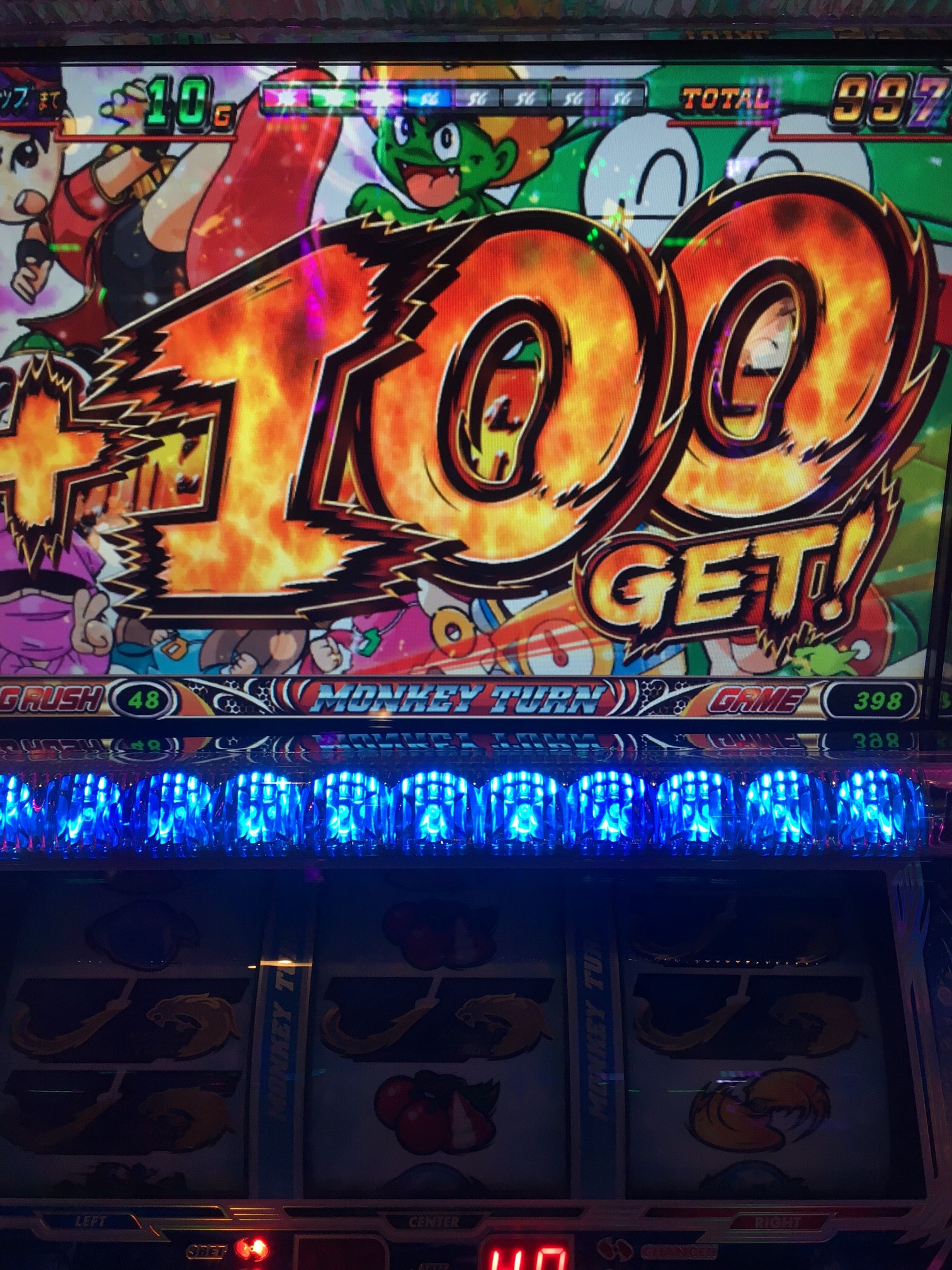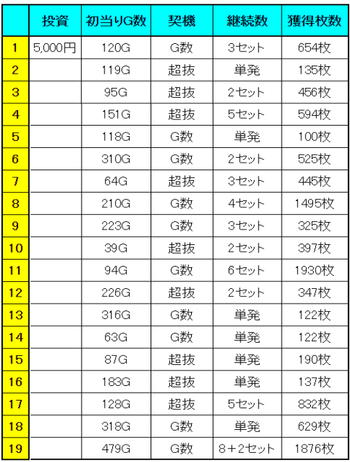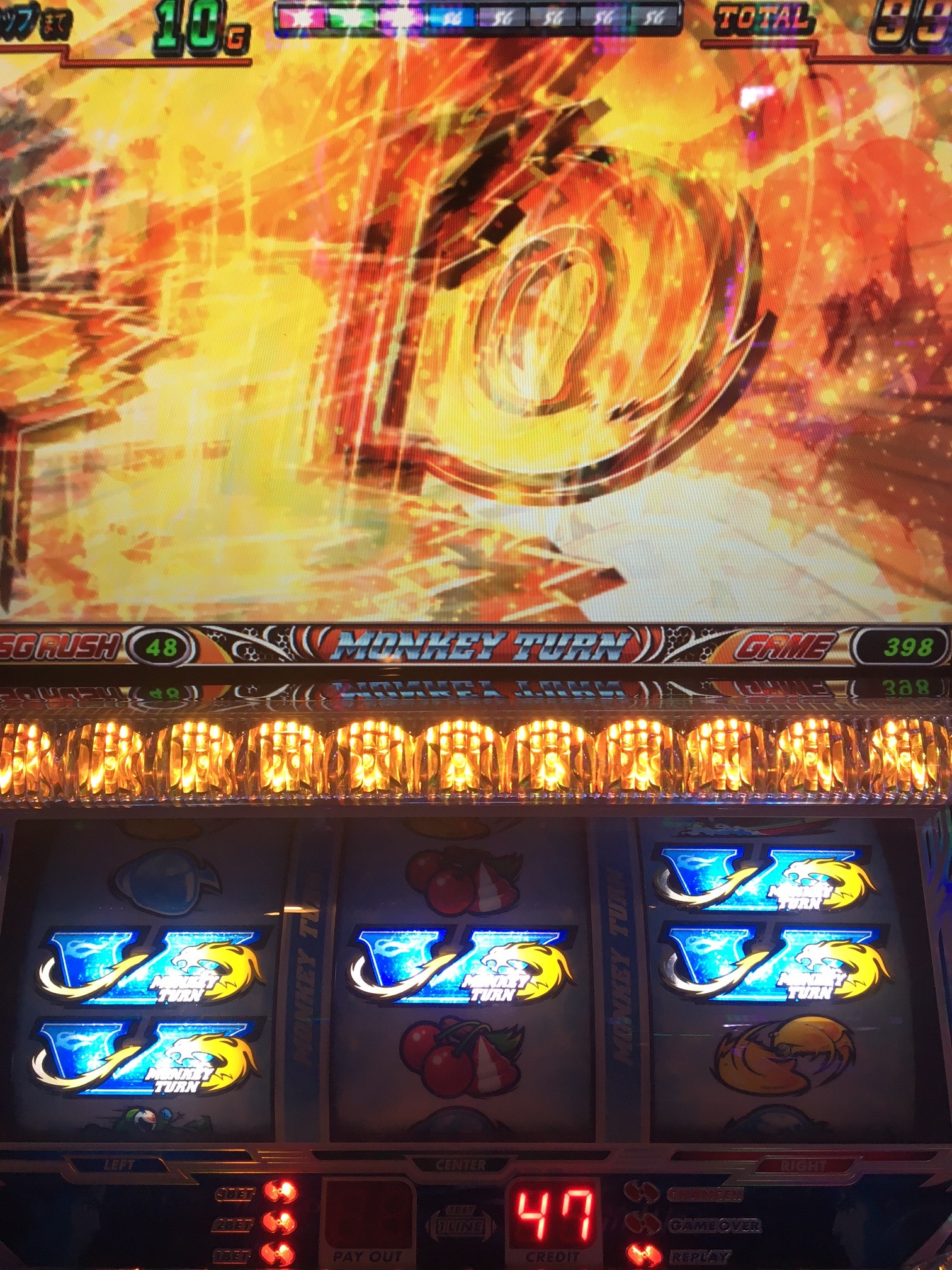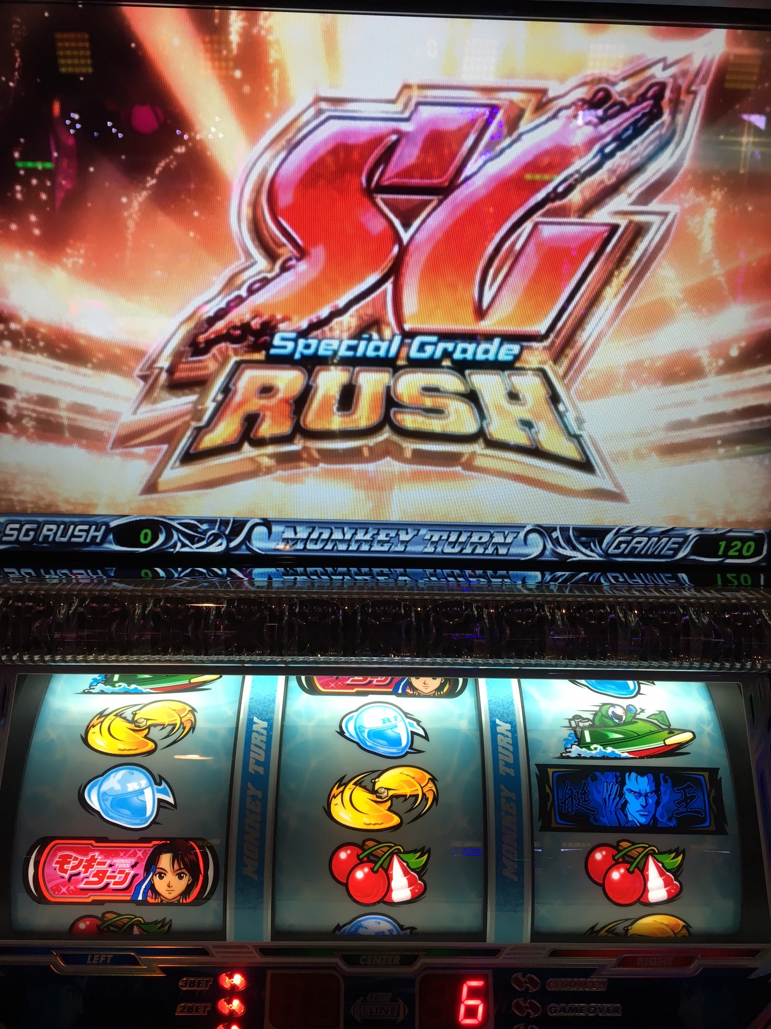 実戦 モンキーターンⅡ 機種実戦 2017年02月17日 0 2月14日の実戦データです。 新台入替えでモンキーターンⅡが1台導入されるホールへ。 9時オープン先着順なので早めに到着。 誰もいない、1番です。 楽々台を確保し実戦開始。 私、モンキーターンⅡはほとんど触ったことがない。 ほぼ初打ちです。 初当りは120G リセットの恩恵ですね。 これがまあまあ伸びてくれて 強チャンス目で50G上乗せ ボートで30G上乗せ 10G+全速モード30G等々、3セット継続の654枚獲得。 このまま追加投資なしでお願いしますと祈りつつ続行。 データをご覧ください。 総回転数8261G SGラッシュ初当りは19回(正確には20回) SGラッシュ総ラウンド数54回 SGラッシュ総G数4628G 100G以上上乗せ5回 SGラッシュ最大継続G数779G SGラッシュ最大獲得枚数1925枚 グランドスラム1回達成 超抜チャレンジ総突入回数18回 超抜チャレンジ総成功回数9回 蒲生 2/6成功 洞口 2/4成功 榎木 5/8成功 全速モード突入回数11回 こんな感じになりました。 全速モードはほぼ上乗せするまで継続タイプを選択。 最大上乗せG数は100Gでした。 Vがダブルで揃っても100G。 派手な上乗せ・派手な継続はほとんど無かったです。 最後にグランドスラムやっと達成できました。 とにかく穏やか! 最大ハマリが最後の479G。 1度くらいは天井くらうと思ってたが全くなし。 これは高設定でしょうね。 万枚狙ってたけど、遠く及ばずでした。 穏やかに、しかし着実に右肩上がりのスランプグラフ。 投資5,000円 回収6,128枚 プラス117,500円 今月、これまで厳しかったので助かりました。 大満足! にほんブログ村 よろしければポチッとお願いします パチスロ ブログランキングへ こちらもポチッと! こんな記事も書いています スポンサード リンク 設定6を掴む為のスロット営業解体新書 管理人アボットも購入しました! アボットのレビューを見てみる 設定6を掴むためのジャグラー営業裏話 パチスロあんてな PR http://kinslo.7narabe.net/%E6%A9%9F%E7%A8%AE%E5%AE%9F%E6%88%A6/%E5%AE%9F%E6%88%A6%E3%80%80%E3%83%A2%E3%83%B3%E3%82%AD%E3%83%BC%E3%82%BF%E3%83%BC%E3%83%B3%E2%85%A1実戦 モンキーターンⅡ