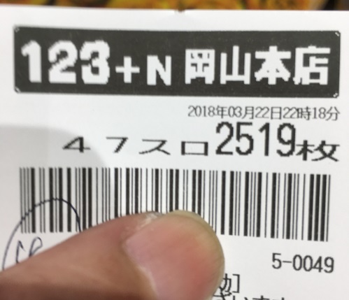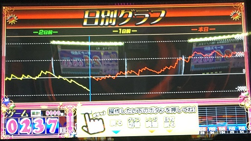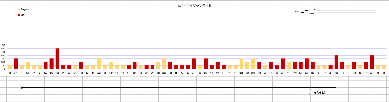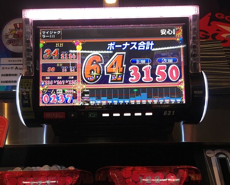実戦!マイジャグラーⅢ 20180322 機種実戦 2018年03月23日 0 3月22日 123+N岡山本店 この所この店、ボッタクリ営業が続いていたが 3月21日はまあまあでした ほぼ満席状態でしっかり稼動していたからかもしれないけど・・・ さて、今日(22日)はどうだろう? そんなにお客はいません などマギ2を打ちたいが誰も打っていないのでやめて ジャグラーの島へ マイジャグラーⅢを2台ほど打ってみるが止めてうろついていると こんな履歴の台が空いた 悪くは無い 現在60G程しか回っていないがまあ打ってみよう 100G以内では当たらないだろうな 300G代では当たって欲しい 当たったのは308GでBIG 投資8000円 次は89GでBIG 47G REG 2G REG と続く ぶどうはそんなに良くはないが履歴は良いので続行 4くらいは有るのではないか? それでは結果 大当たり履歴 ※ホールでの表示に合わせてグラフの向きを変更しました 最後に少し出玉を減らしたのが残念! 総回転数 8000G BIG 34回 REG 30回 獲得枚数 2519枚 ぶどう出現率は一時1/6.2まで上がったが 1/6.3で落ち着く REGの回数や途中もしかして、と思ったこともあったが まあ、4でしょう 昨日はあったかも知れないけど 最近の123は、6はどうも使っていないように思います 状態のいいヤツなら4でも2000~3000枚は出るのでまあ良し 最初のうちは確率やREG比率など全く当てになりません 状態の良い台を見つけるならG数履歴は見るべき 総投資 16,000円 回収 53,500円 プラス 37,500円 十分です! にほんブログ村 よろしければポチッとお願いします パチスロ ブログランキングへ こちらもポチッと! こんな記事も書いています スポンサード リンク 設定6を掴む為のスロット営業解体新書 管理人アボットも購入しました! アボットのレビューを見てみる 設定6を掴むためのジャグラー営業裏話 パチスロあんてな PR http://kinslo.7narabe.net/%E6%A9%9F%E7%A8%AE%E5%AE%9F%E6%88%A6/%E5%AE%9F%E6%88%A6%EF%BC%81%E3%83%9E%E3%82%A4%E3%82%B8%E3%83%A3%E3%82%B0%E3%83%A9%E3%83%BC%E2%85%A2%E3%80%8020180322実戦!マイジャグラーⅢ 20180322