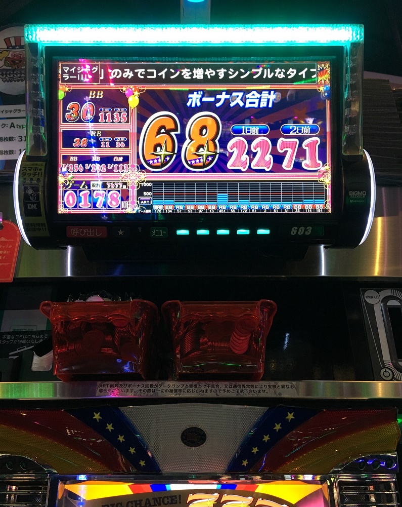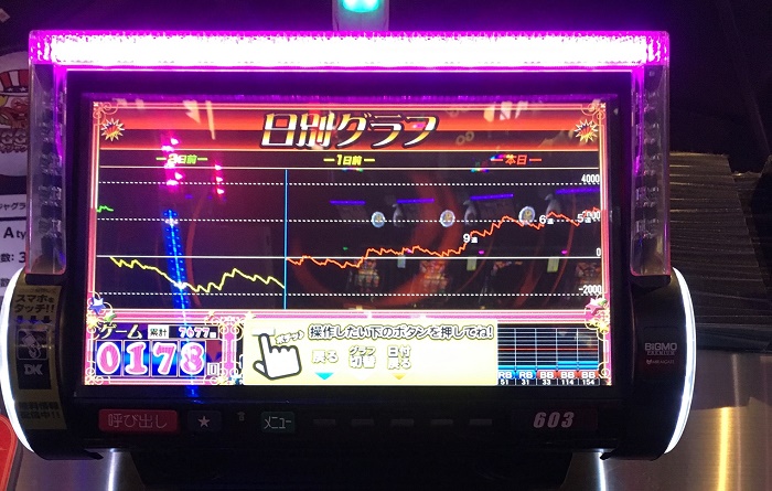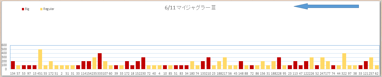 実戦!マイジャグラーⅢ 20180611 機種実戦 2018年06月24日 0 7日・・・マイナス32,000円 8日・・・マイナス23,000円 9日・・・マイナス33,000円 と、ダメージ大き目なマイナス続き なんか・・・勝てない と、こんな状況で11日の実戦結果 この日もゆっくりホール到着 ジャグラーに関しては、狙い台も何も、4があるかどうかも怪しいのでゆっくり出勤です ならそんな店行くなよ! と言われそうだか、ここらのホールはどこもかしこもこんな感じ 仕方ないので、高設定狙いは諦めて、 あまり粘らずハイエナみたいにチョコチョコ流すようにしよう と、方針転換 何台か打ちながらたどり着いたマイジャグラーⅢ 朝一、62GでREGが当たっている台 100G半ばくらいまで回されて放置されていた いつも狙うやつです 希望では100G後半では当たってほしい 100G後半で当たらずとも最悪300G代ではほぼほぼ当たる ※あくまで個人的な考えです すると、257GでREG 次、121GでBIG 33G BIG 38G REG 97G REG ん、なんかいい感じ ぶどうはあまり良くはないが・・・ 結果 BIG 30 REG 38 大当たり履歴 序盤からREG先行で BIG 4 REG 9 その後ちょっとBIGが続いたが、また BIG 11 REG 20 私はREG信者ではない REGが先行するのはあまり調子が良くない台ではないかと考えている 最後までREG先行で終了したが、 これは6ではない! 6でもないのにREGが先行するのは損じゃないですかね? BIGのほうが確率いいのに・・・ 低設定なくせにREGが先行する台、良くありますよね こういう現象も、大人の事情の成せる業でしょう REGが多いからと安易に手を出すのはやめたほうが良いと思いますよ まあ、今回は結果オーライ! 最近高設定がないので、 REG先行だから出玉は増えないし、このまま撃沈するヤツじゃないだろうなと、 不安でしょうがない ぶどうもあまり良くないし 途中、追い金も2度ほどしました ※最終的にはぶどうの出現率は1/6.2くらいに落ち着きました なんで粘ったかと言うと、履歴が良かったから 変な動きを始めたら即止めようと思っていたが、ずっと許容範囲 そうなれば、REG先行とはいえ状態は悪くなかったみたいです むしろ調子が良かったような・・・ ちょっと認識し直しです やっぱり、高設定は似たような”出方”をしますね これも、大人の事情が成せる業でしょう 信じるかどうかはあなた次第! BIG 30回 REG 38回 合成確立1/112.9 総G数 7,677G 獲得枚数 3,018枚 総投資 10,000円 回収 64,200円 プラス 54,200円 一見6と思われそうだが絶対に6ではない! 6ではないが4以上はあるでしょう 個人的には状態の良い4で にほんブログ村 よろしければポチッとお願いします パチスロ ブログランキングへ こちらもポチッと! こんな記事も書いています スポンサード リンク 設定6を掴む為のスロット営業解体新書 管理人アボットも購入しました! アボットのレビューを見てみる 設定6を掴むためのジャグラー営業裏話 パチスロあんてな PR http://kinslo.7narabe.net/%E6%A9%9F%E7%A8%AE%E5%AE%9F%E6%88%A6/%E5%AE%9F%E6%88%A6%EF%BC%81%E3%83%9E%E3%82%A4%E3%82%B8%E3%83%A3%E3%82%B0%E3%83%A9%E3%83%BC%E2%85%A2%E3%80%8020180611実戦!マイジャグラーⅢ 20180611