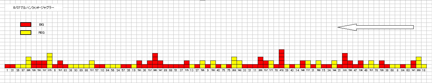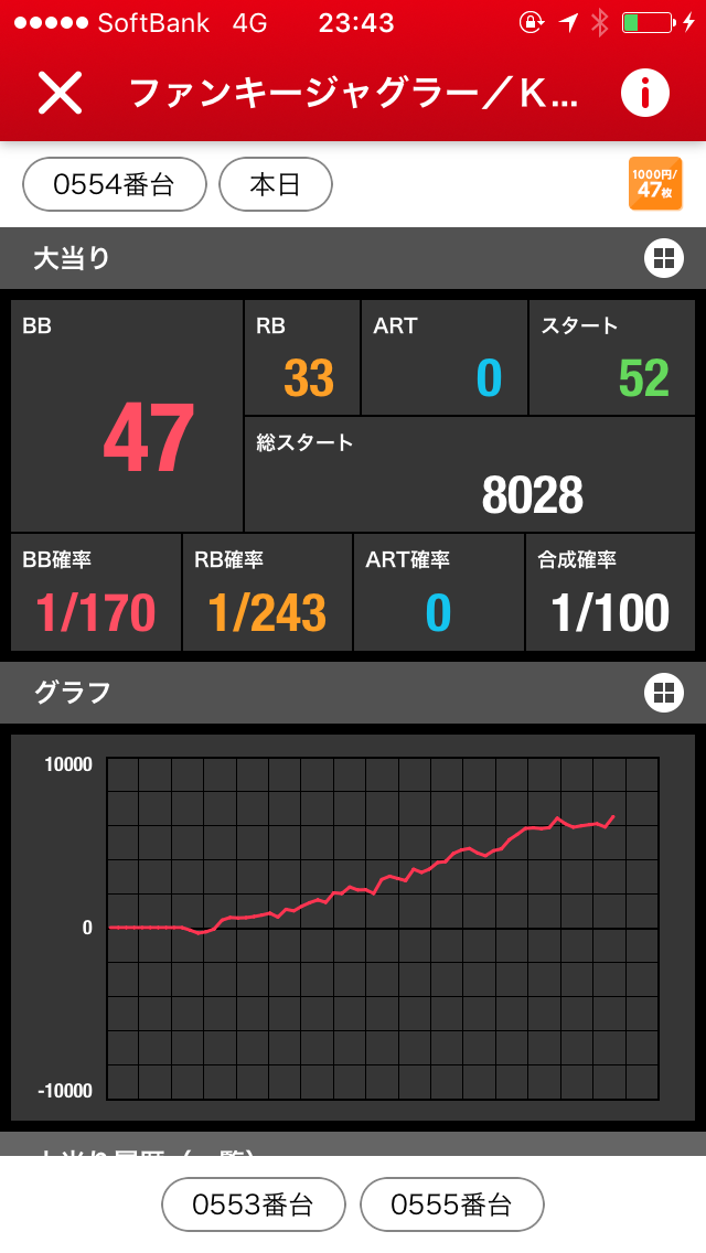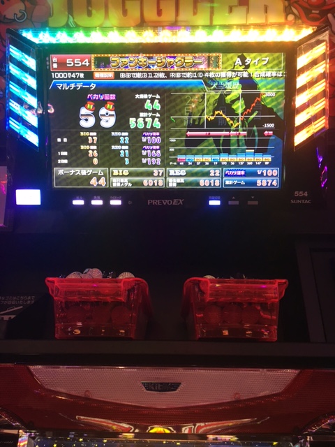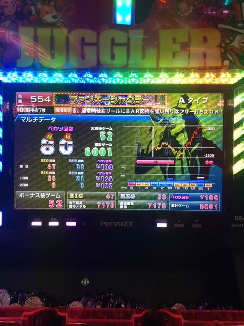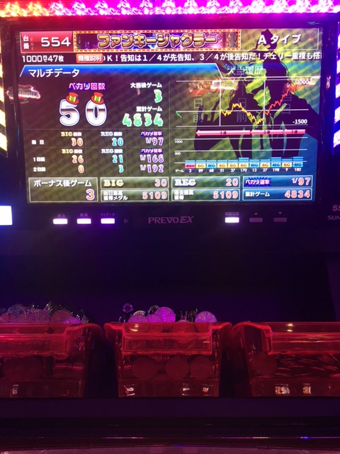 実戦!マルハン7の付く日 ファンキージャグラー 機種実戦 2017年09月08日 0 最近まあまあ調子が良い マルハン効果で周りの店の状況が多少良くなったと思いたい 他にもリニューアルオープンの店舗があったりと忙しく稼動している 色々と選択肢があるのはとても嬉しいですな 前回V店リニューアルでスーパーミラクルジャグラーの高設定つかんだ翌日 27日”7”の付く日 と言うことでマルハンへ行ってきました 特に狙い台も無いし開店してから入店 選んだのはファンキージャグラー というかマイジャグラーは満席だしファンキージャグラーとスーパーミラクルジャグラーくらいしか空きがない 前日、前々日と凹んでいる台を打ち始める が、当たらず、ブドウも全然 満席にならないうちに移動 ほぼほぼ埋まって来ている 履歴をチェックしつつ歩いていると 朝一18GでREG、現在280G 前日のスランプグラフは凹んで後半少し浮上 200G、300Gで当たれば全然まだいける と思い打つ 289G REG 次の早い当りはない 100G代でいいから当たって!と祈りつつ打つと 141G BIG 60G REG 84G BIG 8G REG 68G REG 38G BIG これは!もらった! ブドウもそこそこ良いし打つ理由は出来た 順調に出玉は伸びて 4830Gで5000枚突破 5870Gで6000枚突破 最終的に8001G BIG 47 REG 33 流したメダルは7085枚 履歴 ツールの結果は 6の可能性64% ぶどうの確率が1/6.4と悪いがこれは後半閉店間際でカウントしてなかった為 すっと1/5,9~1/6,2で収まっていました これは6でしょう 6と思いたい マルハンアプリの台データ 綺麗な右肩上がりです このスランプグラフ、出玉によって縦軸の数値が変化すればいいのにね 総投資 8,000円 回収 150,000円 プラス 142,000円 大満足! こちらもよろしく ↓ ↓ ↓ 設定6を掴む為のスロット営業解体新書 にほんブログ村 よろしければポチッとお願いします パチスロ ブログランキングへ こちらもポチッと! こんな記事も書いています スポンサード リンク 設定6を掴む為のスロット営業解体新書 管理人アボットも購入しました! アボットのレビューを見てみる 設定6を掴むためのジャグラー営業裏話 パチスロあんてな PR http://kinslo.7narabe.net/%E6%A9%9F%E7%A8%AE%E5%AE%9F%E6%88%A6/%E5%AE%9F%E6%88%A6%EF%BC%81%E3%83%9E%E3%83%AB%E3%83%8F%E3%83%B37%E3%81%AE%E4%BB%98%E3%81%8F%E6%97%A5%20%E3%83%95%E3%82%A1%E3%83%B3%E3%82%AD%E3%83%BC%E3%82%B8%E3%83%A3%E3%82%B0%E3%83%A9%E3%83%BC実戦!マルハン7の付く日 ファンキージャグラー