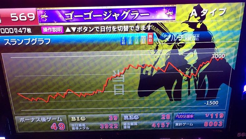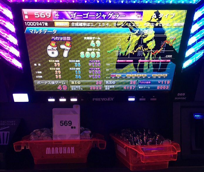 病み上がり実戦 ゴーゴージャグラー2戦目 機種実戦 2017年10月23日 0 16日のゴーゴージャグラー実戦の翌日 17日 7の付く日 と言うことでマルハンへ あれだけマルハンはダメだと言っとるくせに・・・ 実際マルハンはダメです! 専業連中、軍団達も殆ど見かけない 7の付く日も見かけない だからこそ、 この日は平日なので休日の7の付く日よりも客はいないだろうし 専業が少ないので良い台が空く可能性もあるし 立ち回りが可能だと判断した為です 自分で耕すつもりはさらさら無いのでゆっくり昼前に入店 やはり空台も目立つ まだまだ分からないであろうファンキージャグラーを打つ 300Gくらいから 800G越えても当たらない 本当ならば当たるまでやるべきだろうけどこれはいけない こんな履歴でこんなにハマる様では当たっても出ないだろう と言うことで捨てる。 めちゃ、お金使った! その後もチョロチョロと数台打つが全く当たらない 気付けば26000円位使っている いまだノーボーナス やってもーたなぁ としょんぼり歩いていると1台のゴーゴージャグラーをおばちゃんが止めた 履歴を見てみると 朝一、300GでREG・200GでBIG・200GでBIGみたいな感じ その後軽く連チャンして ギザギザながらも若干右上がりなスランプグラフ 記録していたデータが消えたので詳しく覚えていないが 現在のG数は190Gくらい これは悪くない 早めに当たって欲しいのは山々だがハマッたとしても出るんじゃね? 打ちます! 511G BIG! 本日初ボーナス! 36,000円目! よし! 次ぎは?どうなる? すぐに当たらなくてもよい、でも100G代では当たって! 500Gハマるまではぶどうはまあまあだったが BIG後はぶどう確率極悪! 200G回らず1000円追い金しました 190GくらいでBIG! ぶどう悪かったけど、よし! その後一発遅めの連チャンして 100G・!00Gみたいな感じでまた遅めの連チャン つぎの190Gから少々やる気の連チャン! ぶどうもすこぶる良くなる 終わってみれば BIG39 REG28 獲得枚数3,502枚 この台も差枚2000枚越えたあたりで下降 でも一度少しピークを越えてたのでそのまま右肩上がりになるか?! と思ったが直後に急降下!! 780Gハマリ! しかもREG!! この大ハマりはやばい! やッちまったか? やっぱりマルハンか? するとやはり160GくらいでBIG 早いのが1発来て 次の190Gくらいからやる気満々の連チャン! 一気にピークを越えてくれました ハマり後のこの出方、良くあります ぶどうは中盤まで良かったけど、最後に確認したときには 1/7.0と微妙 ゴーゴージャグラーのぶどう確率は他のジャグラーと比べると悪いので 下振れすることも大いにあるけど この台は4以上だと思うが確信はもてない さらに粘っていたらとんでもなくクソハマりするかもしれません いやいやジャグラー難しい 総投資37,000円 回収74,500円 プラス37,500円 病み上がり2日目 まだ風邪完治せず・・・ にほんブログ村 よろしければポチッとお願いします パチスロ ブログランキングへ こちらもポチッと! こんな記事も書いています スポンサード リンク 設定6を掴む為のスロット営業解体新書 管理人アボットも購入しました! アボットのレビューを見てみる 設定6を掴むためのジャグラー営業裏話 パチスロあんてな PR http://kinslo.7narabe.net/%E6%A9%9F%E7%A8%AE%E5%AE%9F%E6%88%A6/%E7%97%85%E3%81%BF%E4%B8%8A%E3%81%8C%E3%82%8A%E5%AE%9F%E6%88%A6%E3%80%80%E3%82%B4%E3%83%BC%E3%82%B4%E3%83%BC%E3%82%B8%E3%83%A3%E3%82%B0%E3%83%A9%E3%83%BC2%E6%88%A6%E7%9B%AE病み上がり実戦 ゴーゴージャグラー2戦目