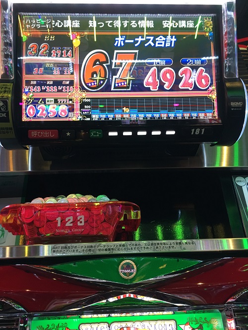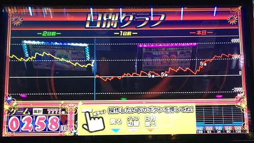結果発表!グランドオープン3・4・5・6日目まとめ 機種実戦 2018年01月04日 0 昨日(1月3日)2018年度の初打ちに行ってきました 今年最初の実戦機種はゴーゴージャグラー 投資1000円 回収38100 プラス37100円 という結果でスタートは順調です! さて、昨年末グランドオープンした 123+N岡山本店の3日目~6日目の結果まとめです グランドオープン3日目 ハッピージャグラーⅦ この日の実戦データはメモって無いのでいきなり結果 BIG 32 REG 35 総回転数 7771G 獲得枚数 2810枚 投資 11,000円 回収 56,200円 高設定らしい挙動で快勝! グランドオープン4日目 この日は抽選参加拳を持って無かったので昼前に様子見に行き ハッピージャグラーⅦを打つ 投資19000円 回収16100円 マイナス2900円 グランドオープン5日目 平日なので朝一はマイジャグ、スーパーミラクル以外のジャグラーはよく空いている ゴーゴージャグラーを打つがあまりぱっとしない しかし粘る! 夜20時頃だったかに全くハマらず4000枚以上出た隣のハッピーが空いたので移る まだ6000円しか使っていないので少しでもプラスにならんかな? 150Gくらい~ 339G BIG 57G BIG 78G REG と当たるがその後 痛恨の980GハマリでBIG いやな予感はしていた こいつは出ないやつかもしれない・・・ 案の定、次は300G代でREG 次は100G代でまたREG その後300Gまで回したが当たらず残り時間もわずかなのでヤメ 投資 34,000円 回収 0円 マイナス 34,000円 グランドオープン6日目 ゴーゴージャグラー 4日目あたりからクソ台が混じりはじめている 凹み台の上げ狙いでゴーゴーを打つが そのまんまクソ台のようなので移動 移動先もゴーゴージャグラー REGの連続で少々投資はかさんだが 2000枚弱の出玉を確保 660G程ハマったがすぐに連チャンして元の戻るが こんな形の後はハマんだけどな~ と、いやな予感 やっぱり100G代でも当たらずクソハマリ! あまり時間もないし全部飲まれるのもいやなので当たらずヤメ すぐにおっさんが座ってました 後でデータを見ると800Gハマり しかし、ピークには届いてなかったけどほぼほぼ戻っていました やっぱり打ってても良かったのか・・・ もったいない 獲得枚数 800枚 投資 30,000円 回収 16,000円 マイナス 14,000円 123+N岡山本店グランドオープン6日間結果 初日 プラス 43,100円 2日目 プラス 38,600円 3日目 プラス 45,200円 4日目 マイナス 2,900円 5日目 マイナス 34,000円 6日目 マイナス 14,000円 トータル プラス 76,000円 3勝3敗 微妙な結果です・・・ ガッツリプラスになったら以前紹介した 設定6を掴むためのジャグラー営業裏話 を購入しようと思っていたのですが、先送りです 購入したら,どの様な内容か報告します 一応,今年最初はプラススタート出来たので この調子で今年も頑張ります! にほんブログ村 よろしければポチッとお願いします パチスロ ブログランキングへ こちらもポチッと! こんな記事も書いています スポンサード リンク 設定6を掴む為のスロット営業解体新書 管理人アボットも購入しました! アボットのレビューを見てみる 設定6を掴むためのジャグラー営業裏話 パチスロあんてな PR http://kinslo.7narabe.net/%E6%A9%9F%E7%A8%AE%E5%AE%9F%E6%88%A6/%E7%B5%90%E6%9E%9C%E7%99%BA%E8%A1%A8%EF%BC%81%E3%82%B0%E3%83%A9%E3%83%B3%E3%83%89%E3%82%AA%E3%83%BC%E3%83%97%E3%83%B33%E3%83%BB4%E3%83%BB5%E3%83%BB6%E6%97%A5%E7%9B%AE%E3%81%BE%E3%81%A8%E3%82%81結果発表!グランドオープン3・4・5・6日目まとめ
