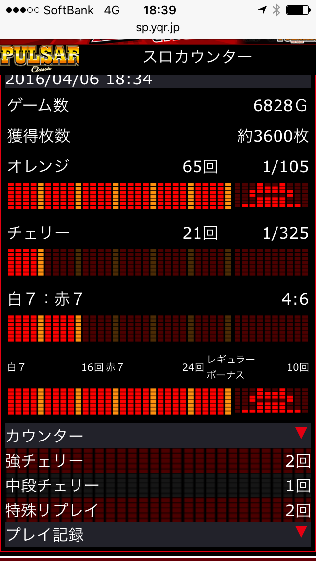 過去データ キングパルサー~DOTPULSAR~ 機種実戦 2017年01月23日 0 2016年4月6日、近所のホールへ。 キングパルサー~DOTPULSAR~ 新台入れ替え2日目。 昔、スロットで生活してたころメインで打っていたキングパルサーの後継機ということで、 とても楽しみにしていた機種。 この店は新台初日から朝9時オープン。 たぶん設定はさほど良くない。 どうなっても打ち切ろうと思い、一応、10万円持ってホールへ。 3台導入の一番カドを押さえる。 初当りは80Gくらいだったと思う →たしか単発 次の当りは130くらい →たしかBIG1REG1の2連 ~ 覚えていないため省略 ~ 512のゾーンを越えて中段チェリー! 超天国移行を期待したがただの天国1000枚弱 ~ 覚えていないため省略 ~ 出玉飲まれて追い金。750G過ぎたところで特殊リプレイ!(オレンジはずれ) からのフリーズ!! 参考動画 動画では中段チェリーですが、私は特殊リプレイでした。 プッシュボタンが表示されて、ボタンを押すとフリーズしました。 これで超天国モード確定。 これが BIG29 REG3 計32連。 超天国は天国モードよりもBIG比率が高くなるので出玉増加スピードも速い。 どうなっても打ち切ろうと思っていたが128G抜けたらやめました。 スロットプラス 総回転数 6,828G 獲得枚数 5,060枚 投資 29,000円 回収 101,200円 プラス 72,200円 スロプラのデータでは獲得枚数3,600枚となってますが、これは差枚数なんでしょうね。 出玉的には満足でしたし、ドット表示の演出は懐かしくて良かったが、 キンパルとは全くの別物でした。 残念。 にほんブログ村 よろしければポチッとお願いします パチスロ ブログランキングへ こちらもポチッと! こんな記事も書いています スポンサード リンク 設定6を掴む為のスロット営業解体新書 管理人アボットも購入しました! アボットのレビューを見てみる 設定6を掴むためのジャグラー営業裏話 パチスロあんてな PR http://kinslo.7narabe.net/%E6%A9%9F%E7%A8%AE%E5%AE%9F%E6%88%A6/%E9%81%8E%E5%8E%BB%E3%83%87%E3%83%BC%E3%82%BF%E3%80%80%E3%82%AD%E3%83%B3%E3%82%B0%E3%83%91%E3%83%AB%E3%82%B5%E3%83%BC%EF%BD%9Edotpulsar%EF%BD%9E過去データ キングパルサー~DOTPULSAR~