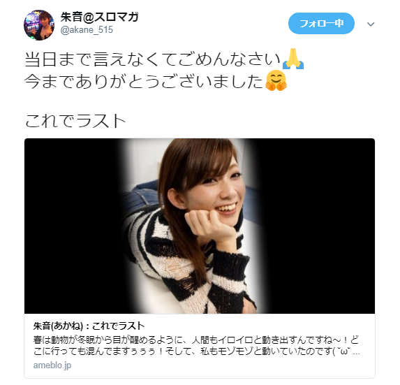 スロマガライター朱音ちん引退!お疲れ様!ありがとう! その他 2018年04月13日 0 4月7日 スロマガの朱音ちんからツイート 朱音ちんのツイートのページ えっ‼ 朱音ちんスロマガ辞めちゃうの⁈ つづきはこちら にほんブログ村 よろしければポチッとお願いします パチスロ ブログランキングへ こちらもポチッと! こんな記事も書いています スポンサード リンク 設定6を掴む為のスロット営業解体新書 管理人アボットも購入しました! アボットのレビューを見てみる 設定6を掴むためのジャグラー営業裏話 パチスロあんてな PR http://kinslo.7narabe.net/%E3%81%9D%E3%81%AE%E4%BB%96/%E3%82%B9%E3%83%AD%E3%83%9E%E3%82%AC%E3%83%A9%E3%82%A4%E3%82%BF%E3%83%BC%E6%9C%B1%E9%9F%B3%E3%81%A1%E3%82%93%E5%BC%95%E9%80%80%EF%BC%81%E3%81%8A%E7%96%B2%E3%82%8C%E6%A7%98%EF%BC%81%E3%81%82%E3%82%8A%E3%81%8C%E3%81%A8%E3%81%86%EF%BC%81スロマガライター朱音ちん引退!お疲れ様!ありがとう!